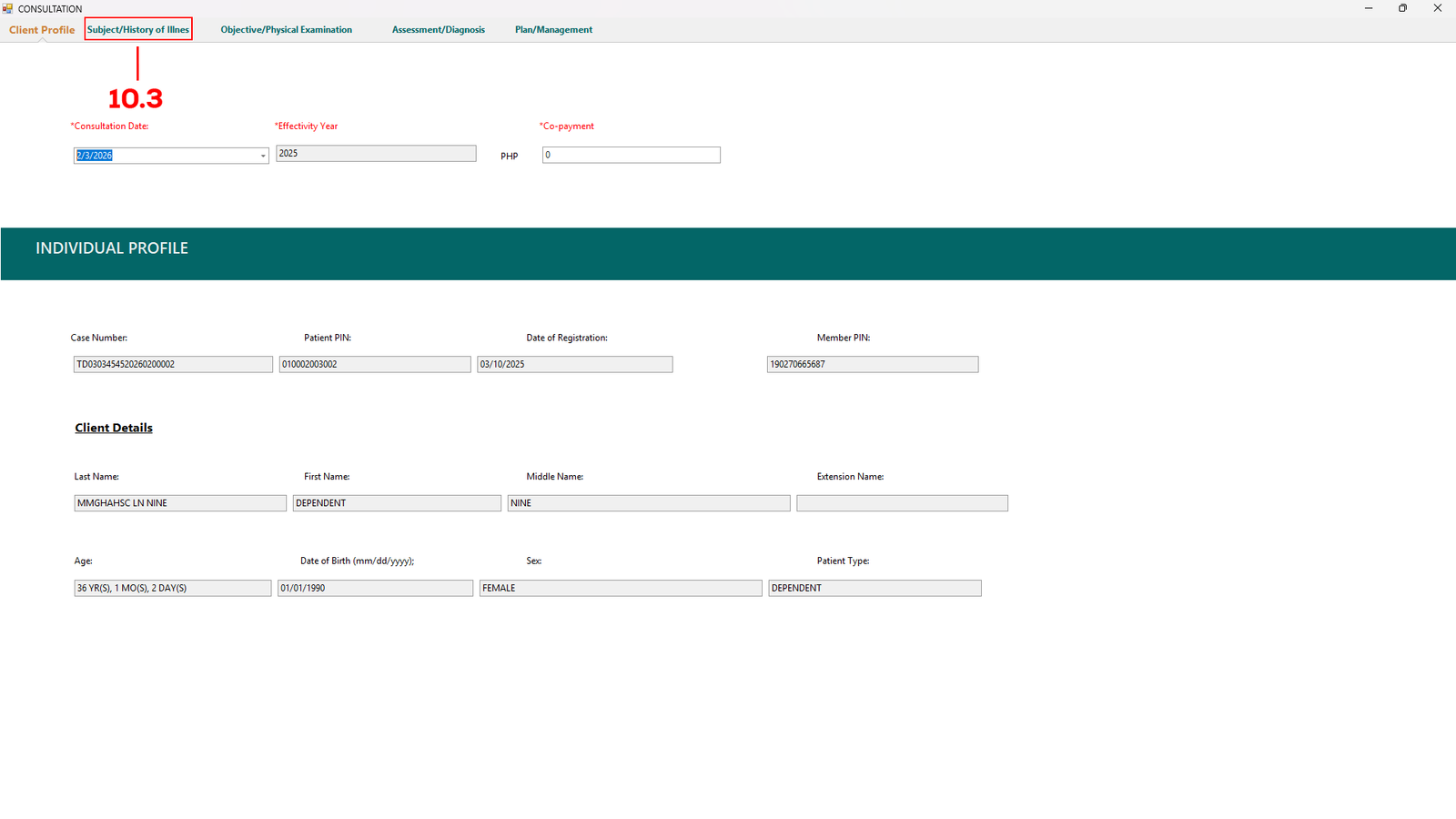 You will be redirect to the Consultation tab, check for everything necessary in this tab then click Subject/History of Illness tab (see 10.3).