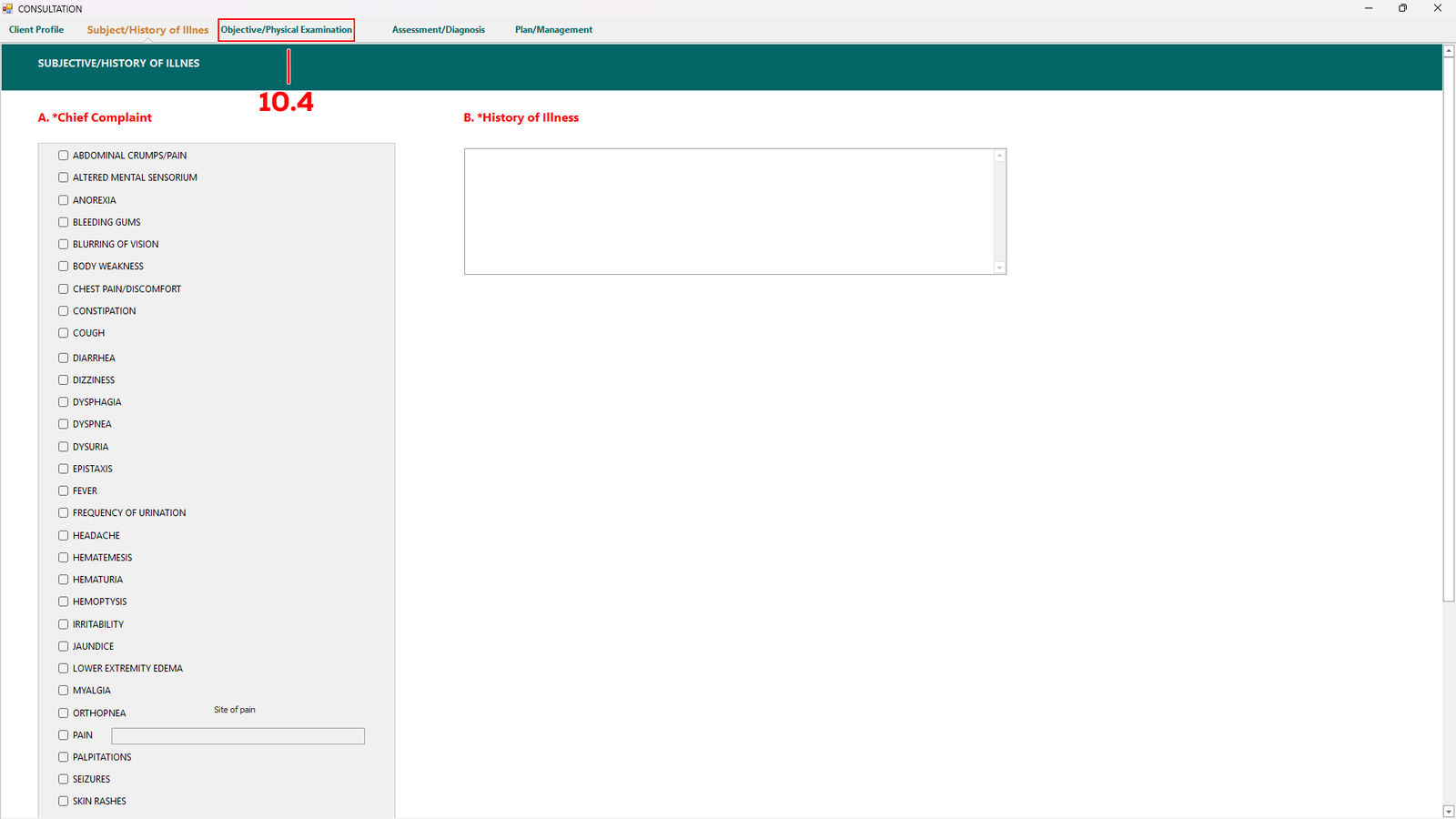 In this tab, choose one from the A. *Chief Complaint column and fill the text box of B. *History of Illness. Proceed to Objective/Physical Exam (see 10.4) tab to continue.