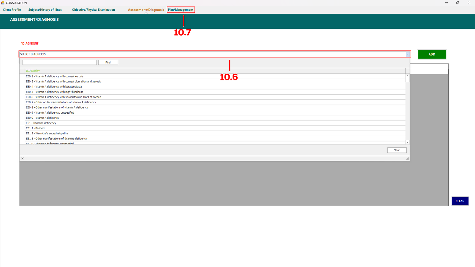 In this tab, select the drop down menu (see 10.6) to choose any diagnosis the patient needed, if not just proceed to Plan/Management tab.