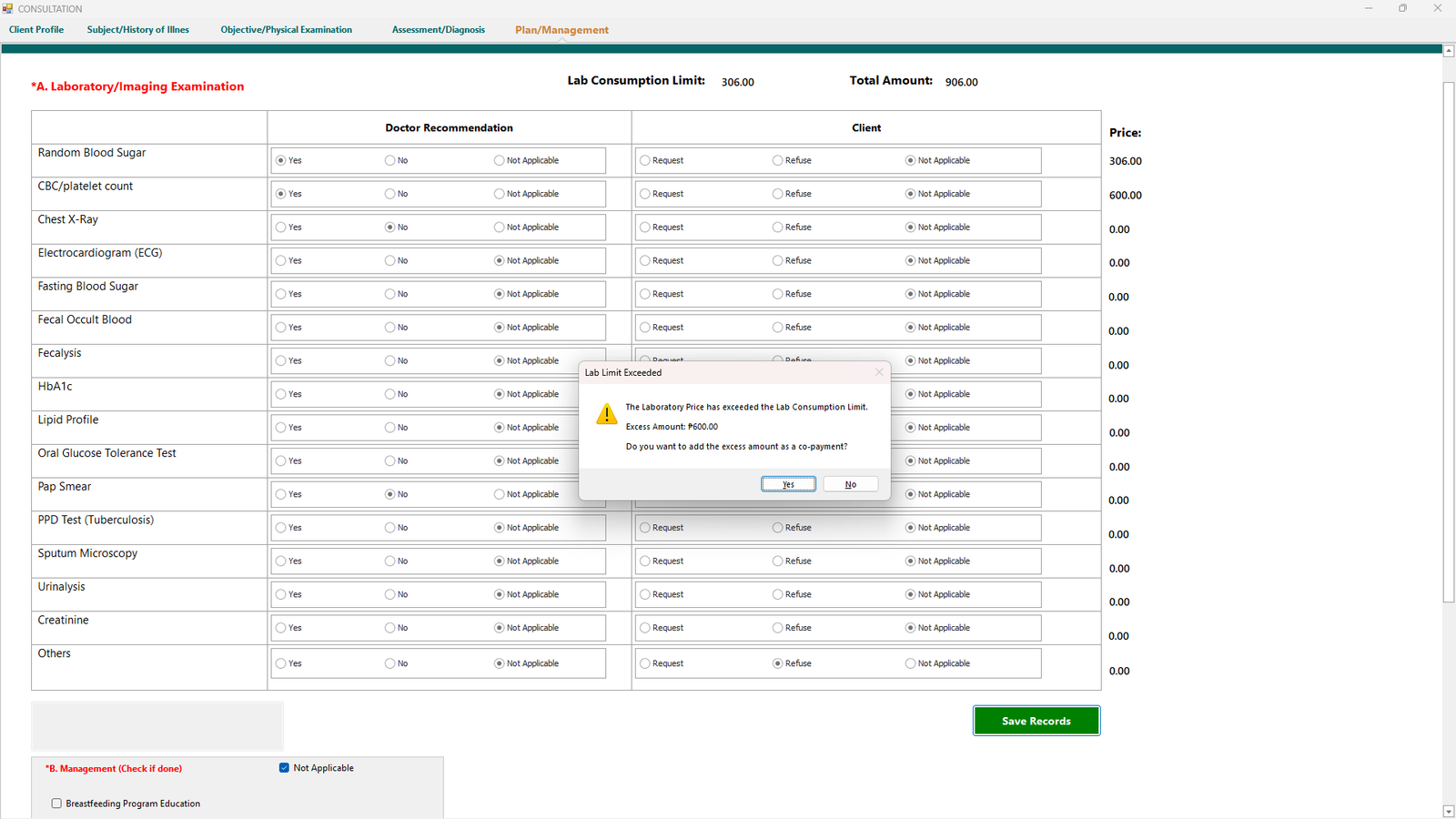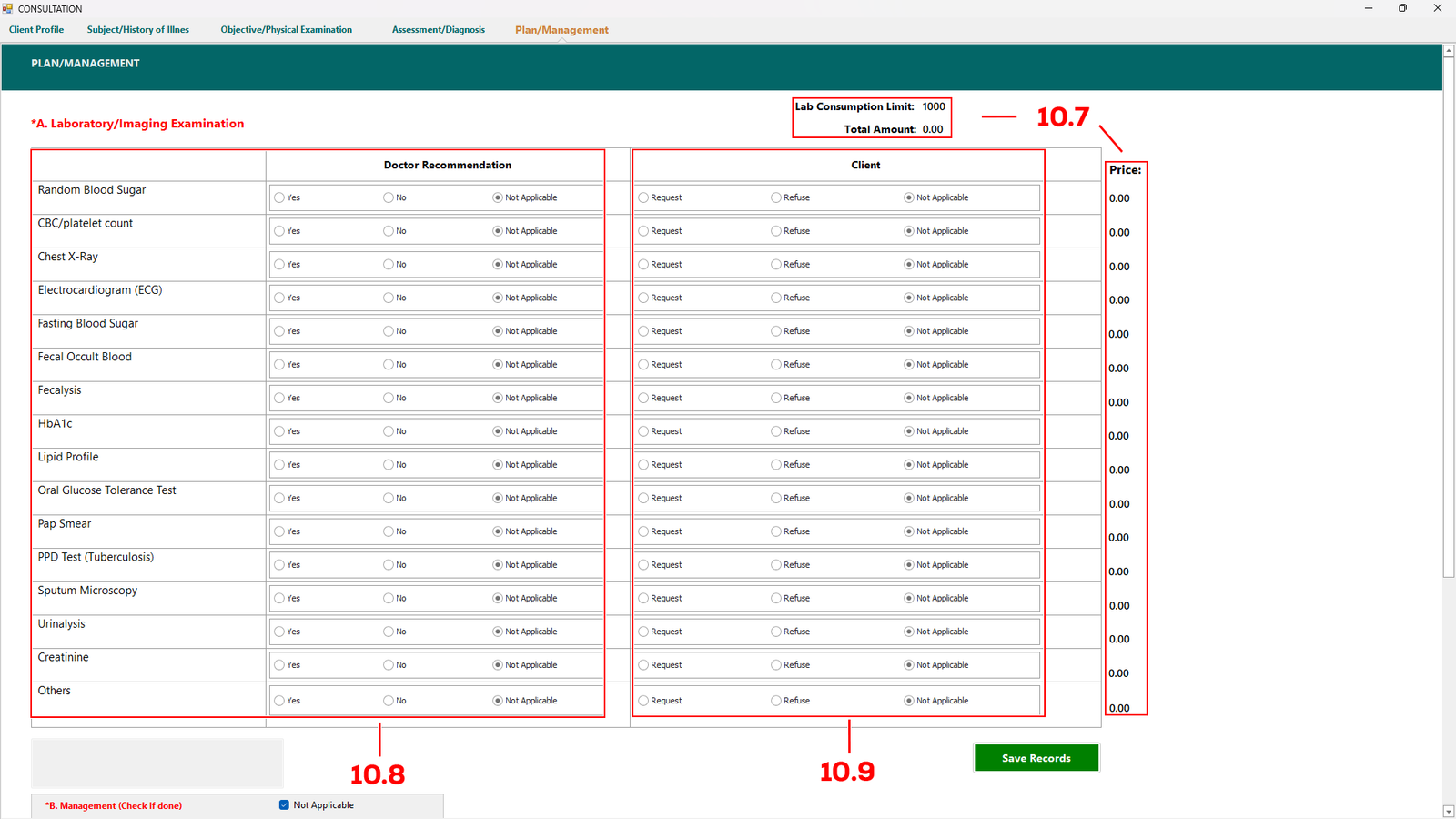 The price of the selected examination will be displayed (see 10.7). At the top of the page, you can also view the Lab Consumption Limit and the Total Amount for the selected examination. Click Save Records if done.