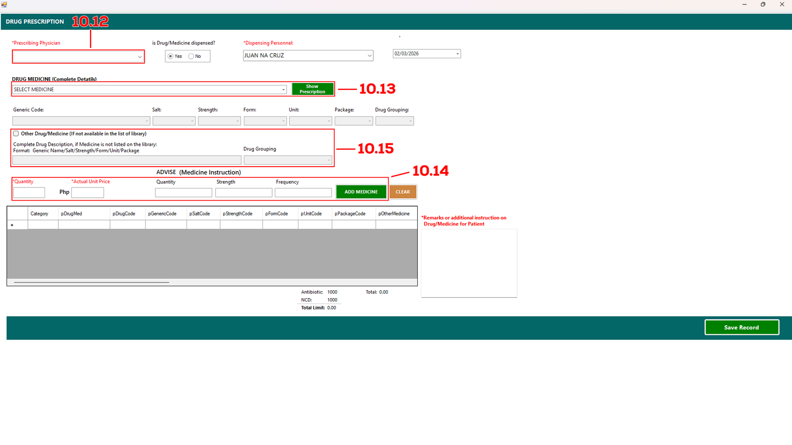 On the right side, indicate whether the Drug/Medicine was dispensed by selecting Yes or No. The Dispensing Personnel field will automatically display the logged-in user.