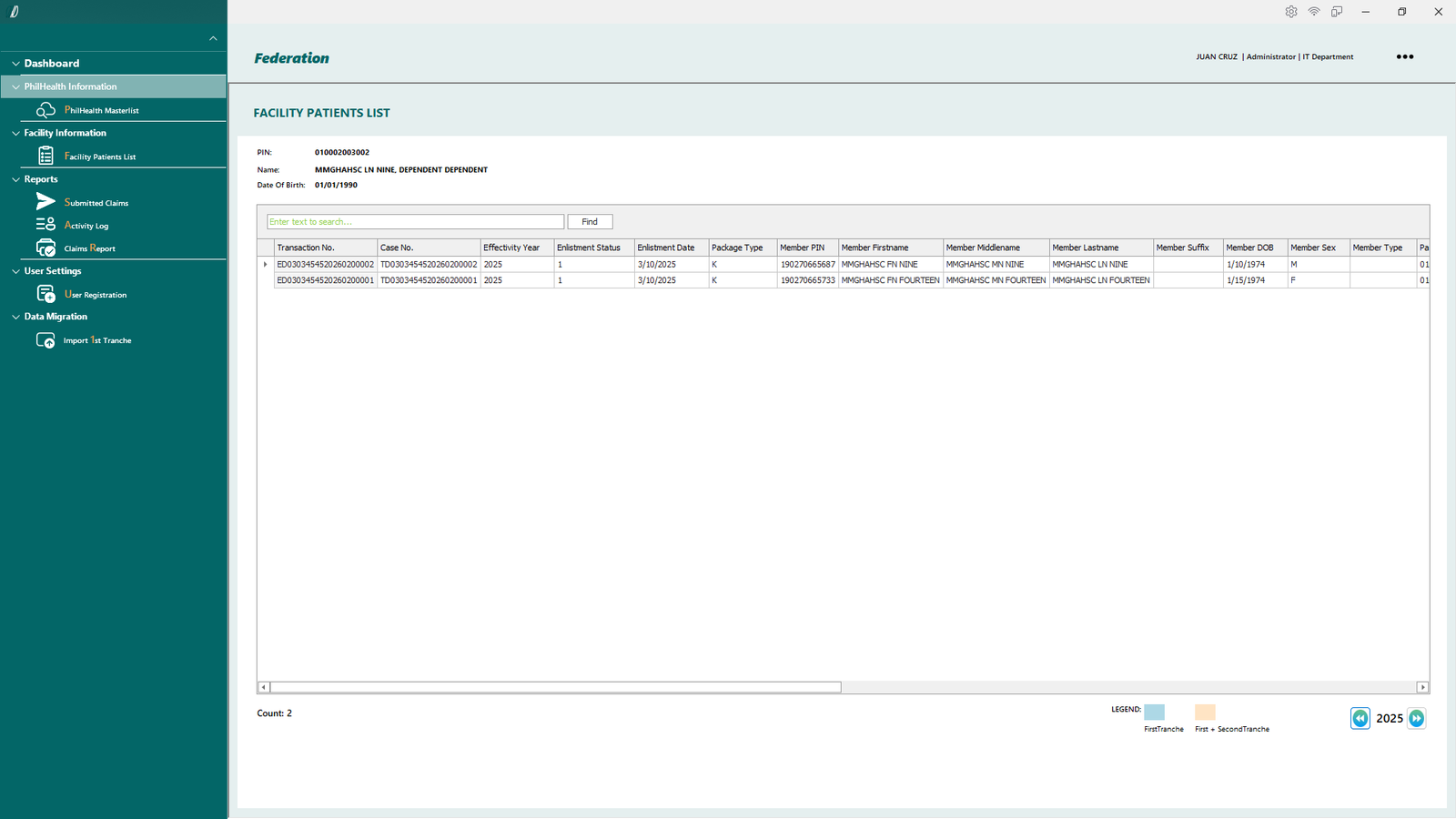 - 2.1.2 Facility Patients List – Displays the list of patients recorded and transacted within the facility.