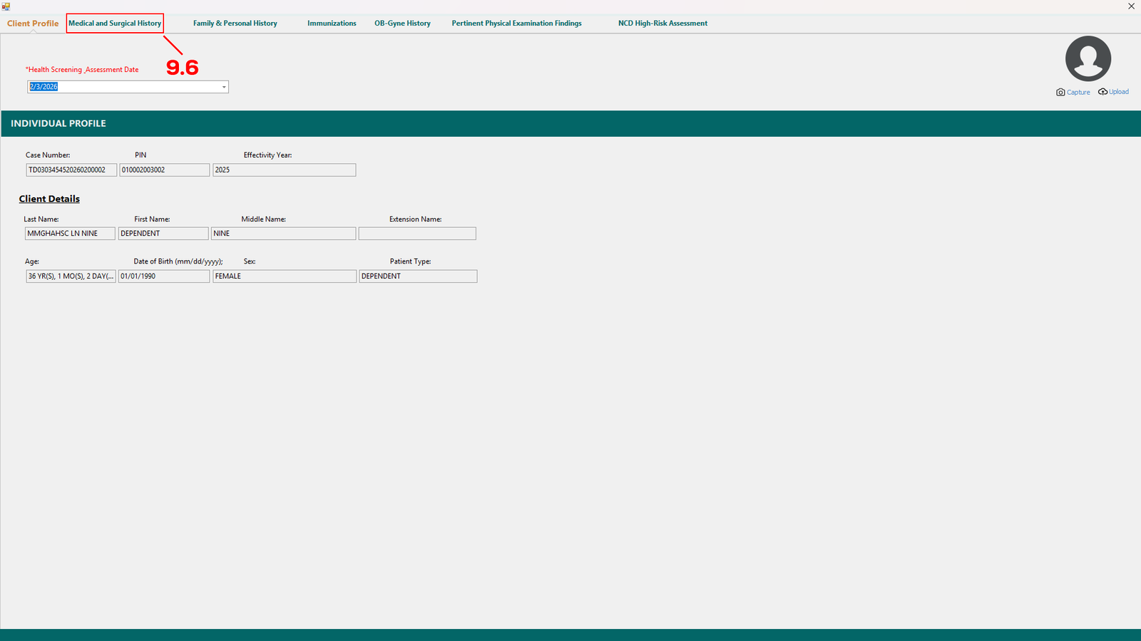 Another window will appear, check the information of the patient, if everything is correct proceed to Medical and Surgical History tab (see 9.6).