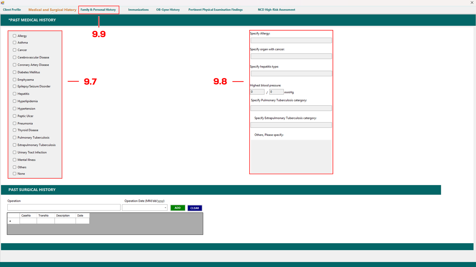 Some diagnosis enquire you to fill up the text box in (see 9.8). If the patient has past surgical history you can add it at the bottom table.