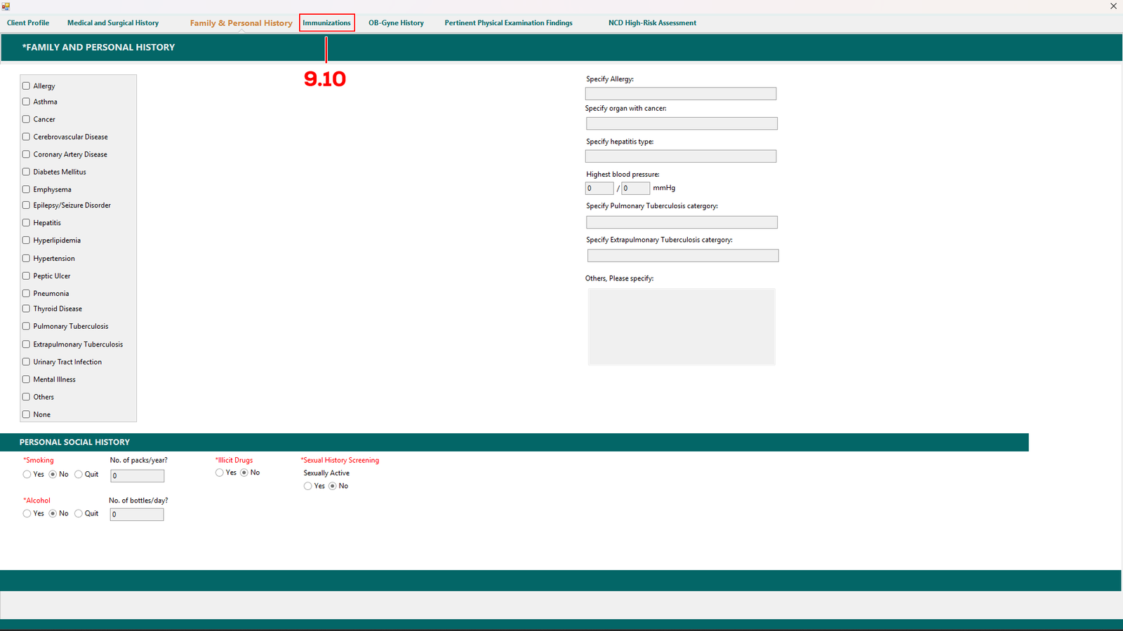 Same goes in the Family & Personal History tab, fill up the patients family and diagnosis history and select what is needed and proceed to Immunizations (see 9.10).