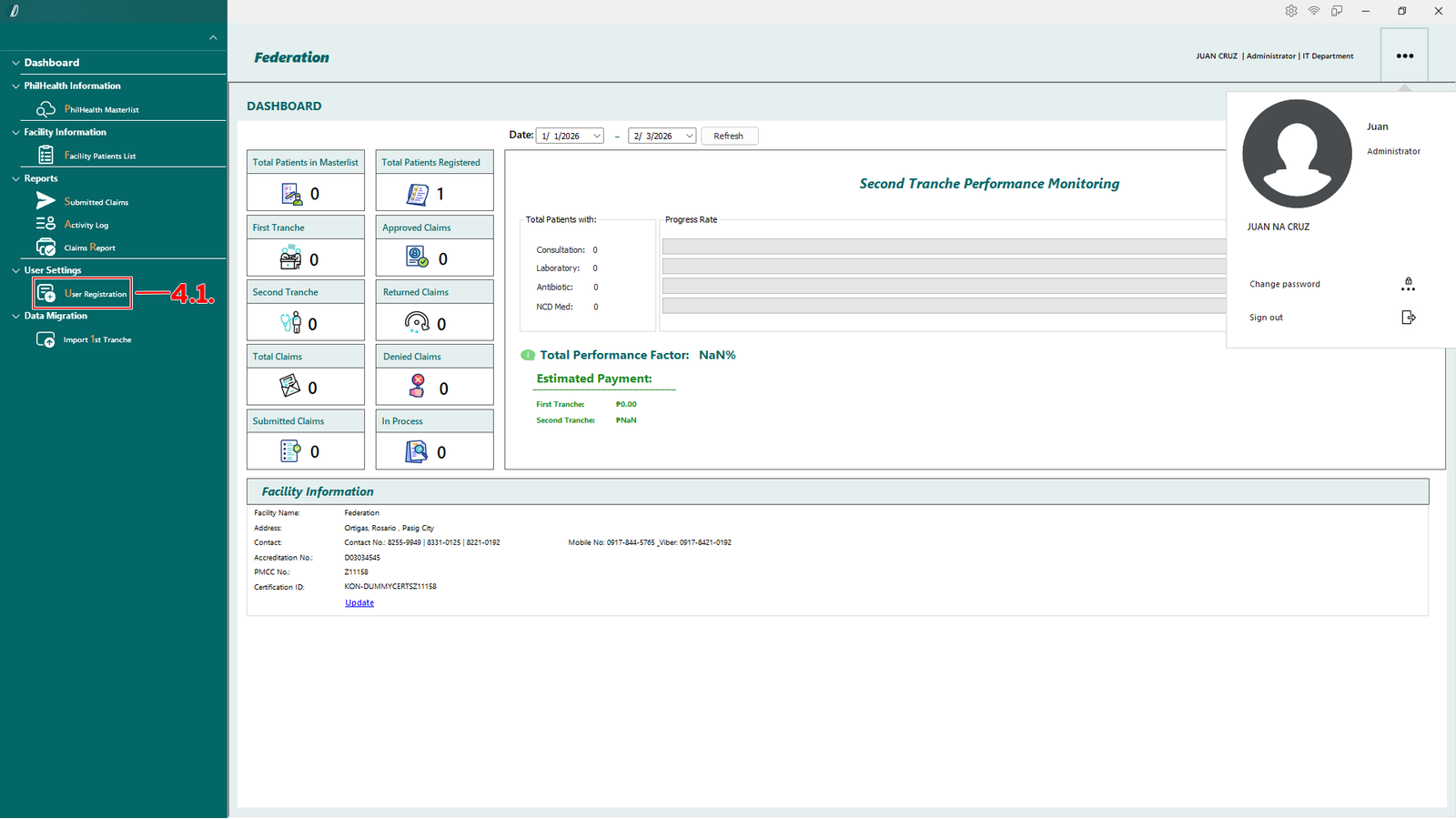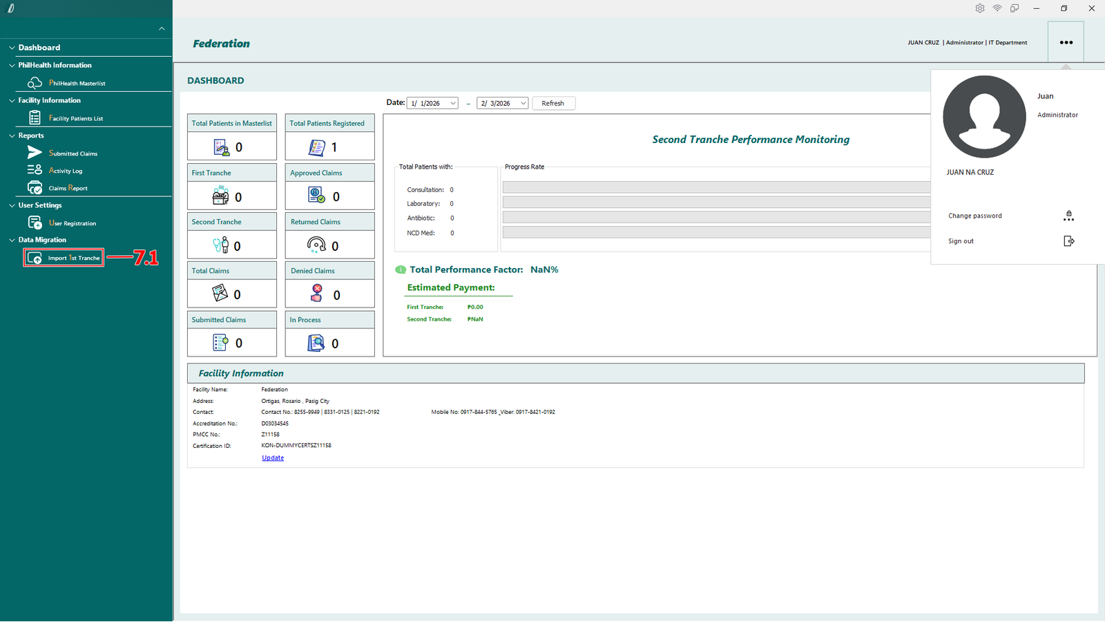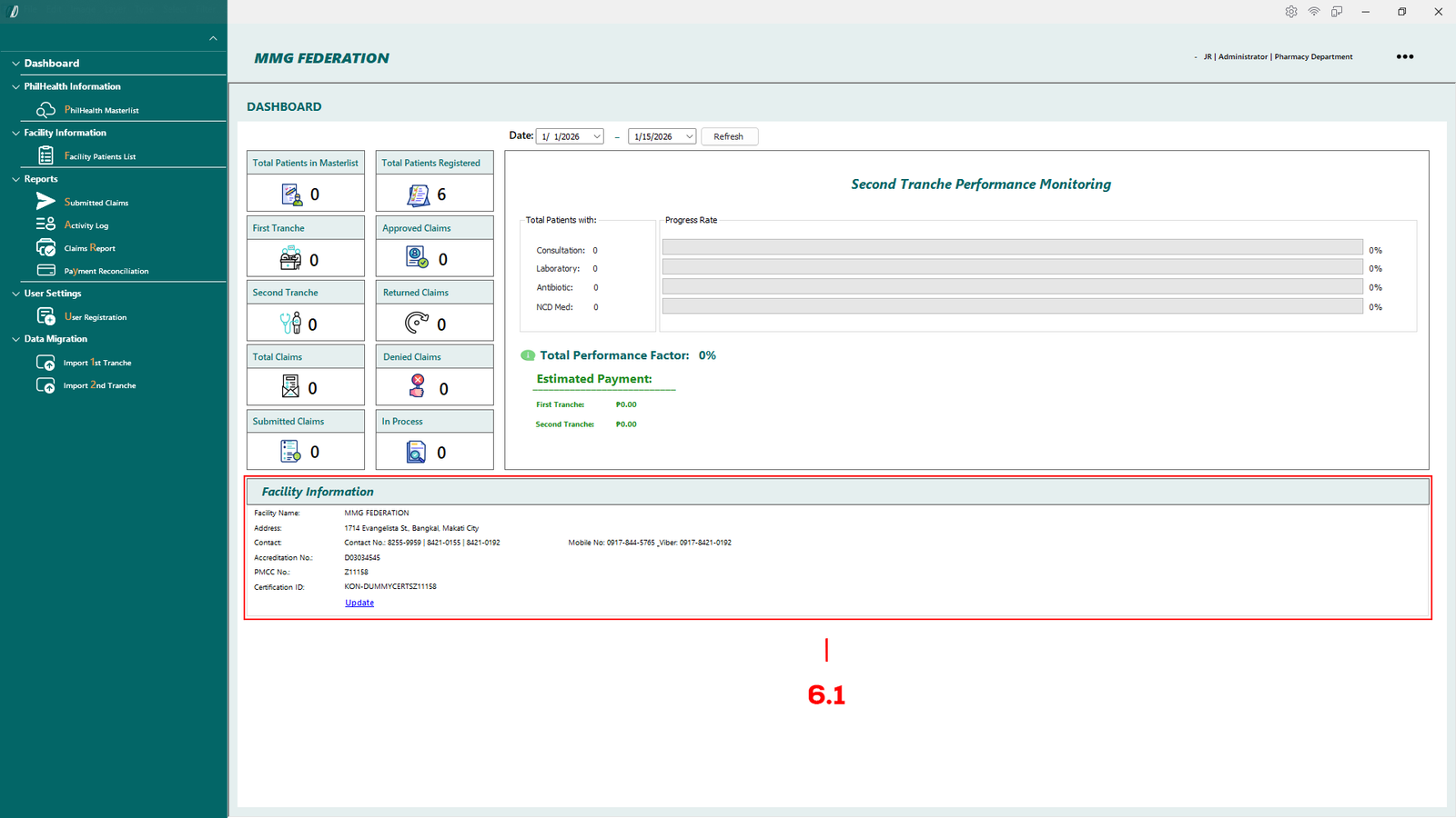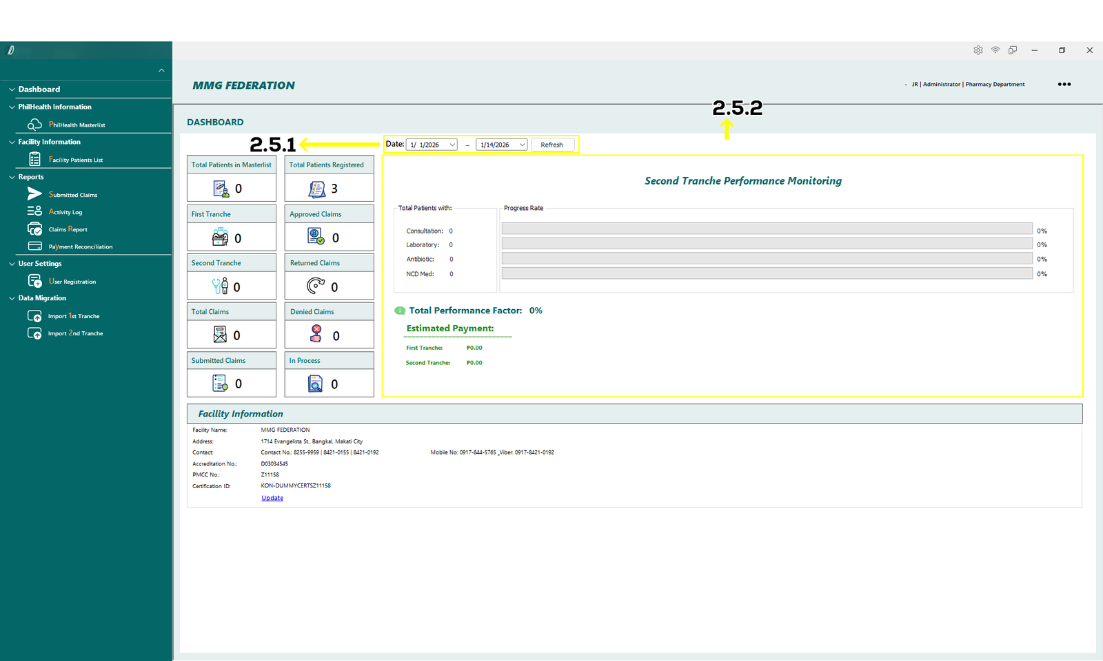 The Dashboard provides a summary view of patient records, claim status, and tranche performance. Data displayed on this screen updates based on the selected date range.