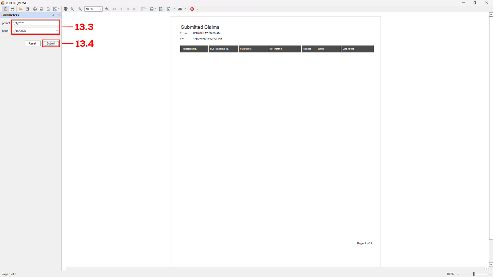 After clicking the Generate button, the Report Viewer Module will open. Adjust the date (see 13.3) to your desired date, then click Submit (see 13.4). The report for the selected date will be displayed on the report page.