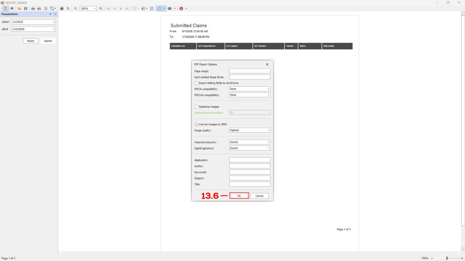PDF Export Options module will appear, click ok (see 13.6) to save the file as PDF.