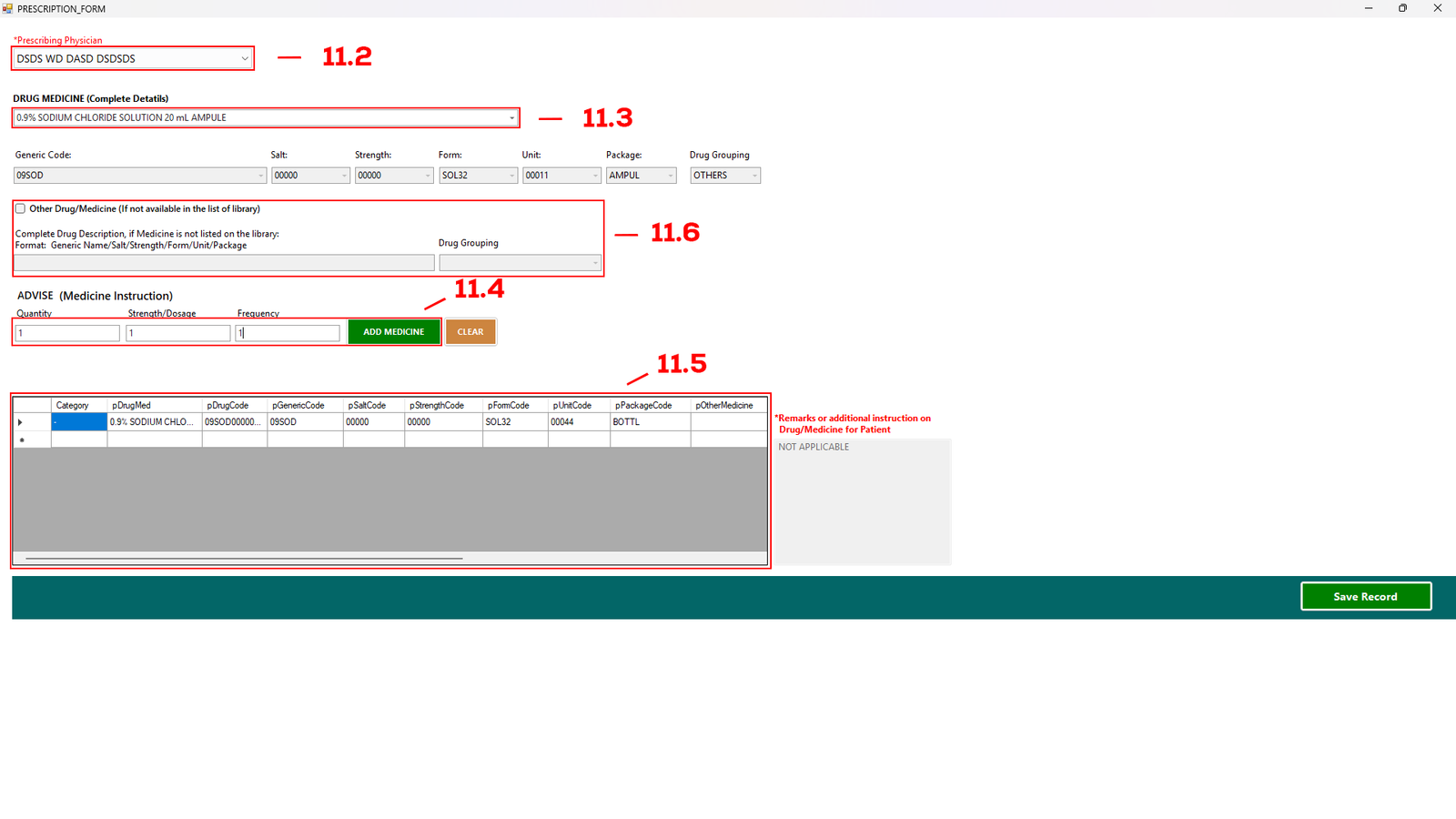 Enter the required Quantity, Strength/Dosage, and Frequency (see 11.4), then click Add. The medicine will appear in the table (see 11.5).